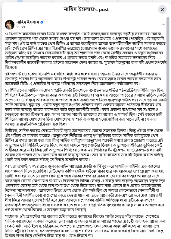জাতীয় সরকার গঠনের প্রস্তাব নিয়ে বিএনপি মহাসচিব মির্জা ফখরুল ইসলাম আলমগীরের বক্তব্যকে “অসত্য” আখ্যা দিয়ে পাল্টা দাবি তুলেছে বৈষম্যবিরোধী ছাত্র আন্দোলনের নেতারা। । তাদের ভাষ্য অনুযায়ী, ৫ আগস্ট রাতের প্রেস ব্রিফিংয়ে তারা স্পষ্টভাবে একটি অন্তর্বর্তীকালীন জাতীয় সরকারের প্রস্তাবনা দিয়েছিল। এরপর ভার্চুয়ালি বিএনপির ভারপ্রাপ্ত চেয়ারম্যান তারেক রহমানের সঙ্গে বৈঠকেও এ প্রস্তাব তুলে ধরা হয়। নাহিদ ইসলাম  তার ভেরিফাইড ফেসবুক পোস্টের মাধ্যমে জানান।