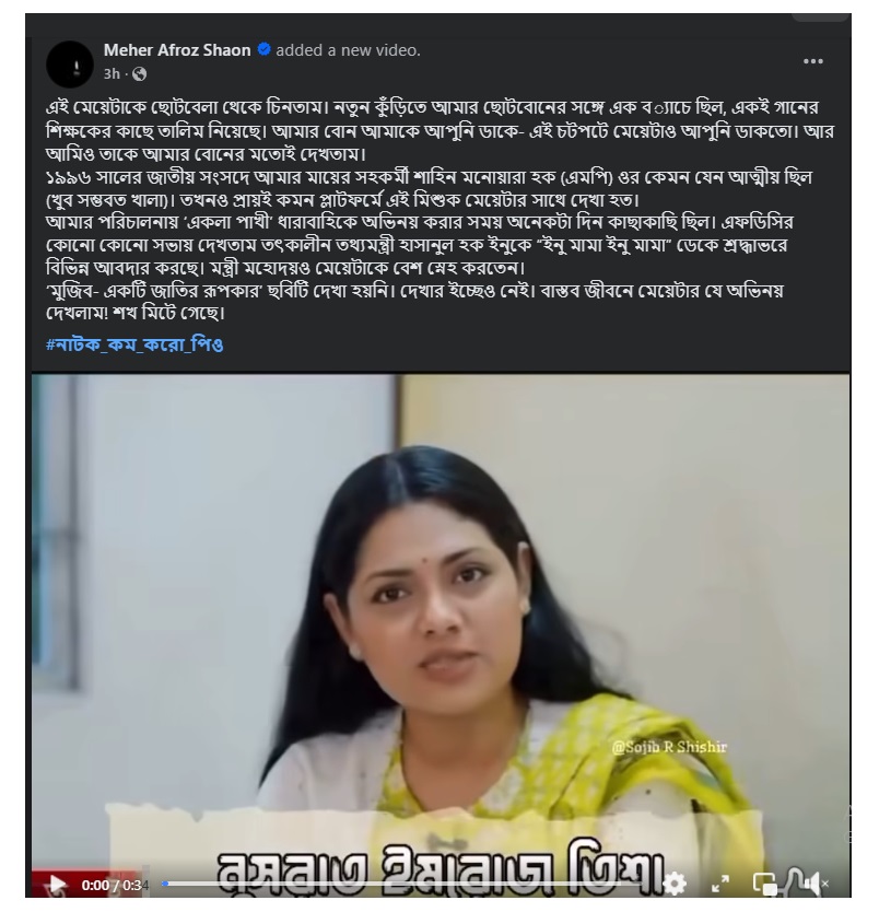 দেশের জনপ্রিয় অভিনেত্রী নুসরাত ইমরোজ তিশাকে উদ্দেশ্য করে কটাক্ষ করলেন অভিনেত্রী, সংগীতশিল্পী ও নির্মাতা মেহের আফরোজ শাওন। রোববার (১০ আগস্ট) দুপুরে নিজের ফেসবুক অ্যাকাউন্টে তিশার কয়েকটি ভিডিও ক্লিপ ও শেখ হাসিনাসহ মন্ত্রীদের সঙ্গে তোলা ছবি পোস্ট করে শাওন লেখেন— “নাটক কম করো পিও”।