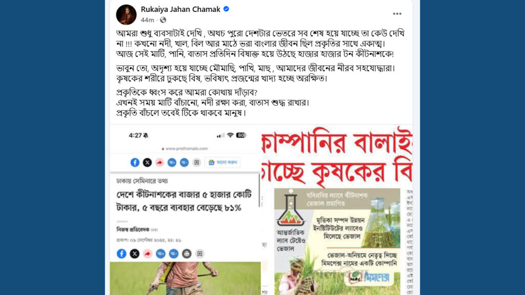 শেষে লিখেছেন, ‘কৃষকের শরীরে ঢুকছে বিষ, ভবিষ্যৎ প্রজন্মের খাদ্য হচ্ছে অরক্ষিত। প্রকৃতিকে ধ্বংস করে আমরা কোথায় দাঁড়াব? এখনই সময় মাটি বাঁচানো, নদী রক্ষা করা, বাতাস শুদ্ধ রাখার। প্রকৃতি বাঁচলে তবেই টিকে থাকবে মানুষ।’