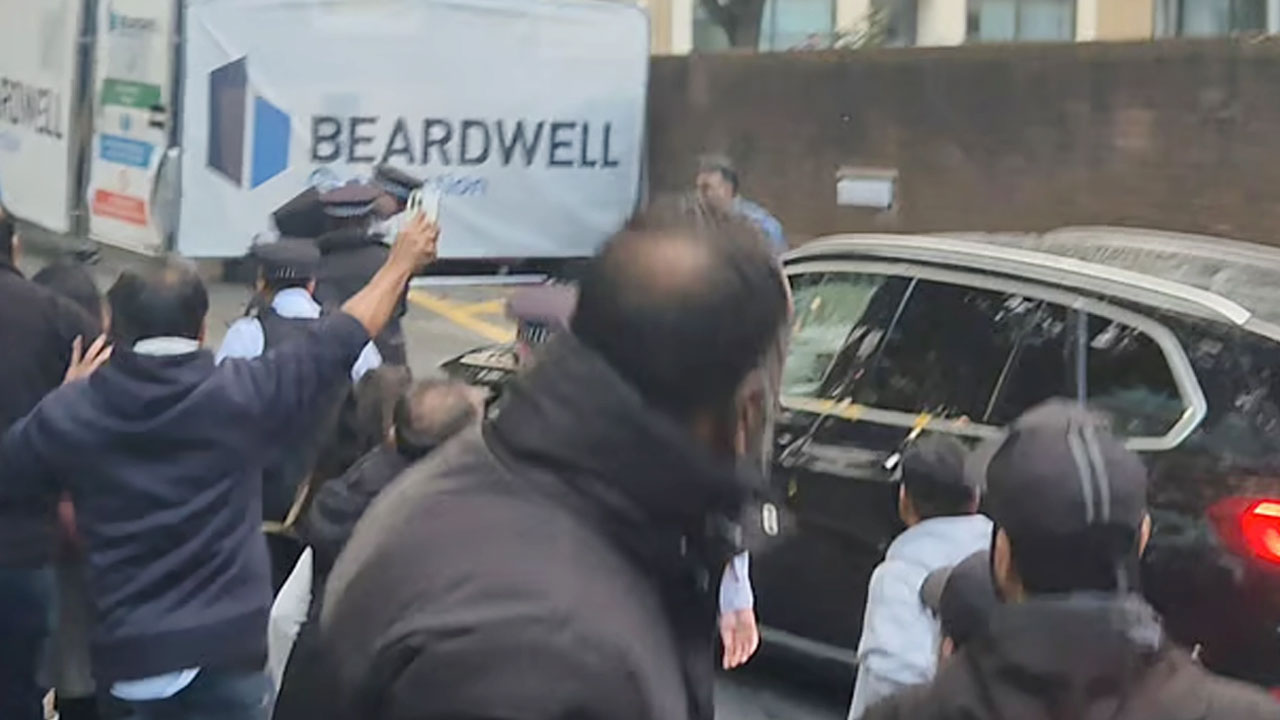 উপদেষ্টা এবং হাইকমিশনের কর্মকর্তারা ভেতরে প্রবেশের পর পার্কিং এরিয়াতে থাকা অপেক্ষমাণ গাড়ির ওপর ডিম নিক্ষেপ করে দুষ্কৃতকারীরা। অনুষ্ঠান শেষে উপদেষ্টা মাহফুজ আলম এবং হাইকমিশনের কর্মকর্তারা একাধিক গাড়িতে করে সোয়াস ক্যাম্পাস ত্যাগ করেন। পরে সেখানে বাংলাদেশ হাইকমিশনের দুটি খালি গাড়ি বের হওয়ার সময় কয়েকজন দুষ্কৃতকারী রাস্তায় শুয়ে প্রতিবন্ধকতা সৃষ্টির চেষ্টা করে এবং আরও কয়েকজন দুষ্কৃতকারী খালি গাড়ি দুটোতে ডিম নিক্ষেপ করে।