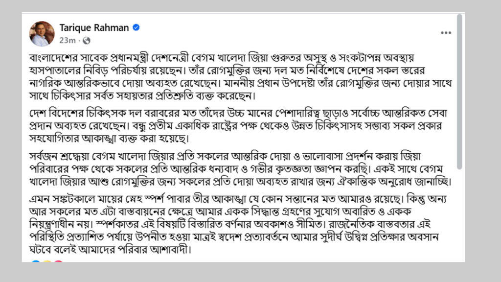 তারেক রহমান তার স্ট্যাটাসে উল্লেখ করেন, খালেদা জিয়া বর্তমানে ‘গুরুতর অসুস্থ ও সংকটাপন্ন’ অবস্থায় হাসপাতালের নিবিড় পরিচর্যায় রয়েছেন। তার রোগমুক্তির জন্য দল-মত নির্বিশেষে দেশের সকল নাগরিক আন্তরিকভাবে দোয়া করছেন।