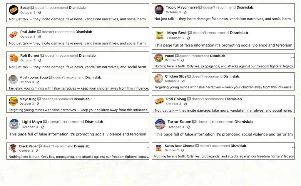 ডিসমিসল্যাবও একইভাবে লক্ষ্যবস্তু হয়। জাতীয় নাগরিক পার্টির (এনসিপি) নেত্রী ড. তাসনিম জারার বিরুদ্ধে অনলাইন হয়রানি নিয়ে প্রতিবেদন প্রকাশের পরপরই এই আক্রমণের শিকার হয় ডিসমিসল্যাব। আক্রমণের ধরনও ছিল একই: দুই থেকে তিন ঘণ্টার মধ্যে একই ভাষ্যের মন্তব্যের বিস্ফোরণ, এবং একাধিক পেজে হুবহু একই লেখায় রিভিউ দেওয়া।